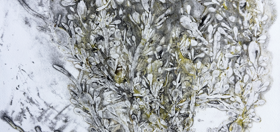Avec Alguier d’été, l’artiste présente le résultat de ses recherches en impression expérimentale à partir d’algues marines. Les monotypes qui en découlent composent un inventaire visuel et poétique où se conjuguent art et science.